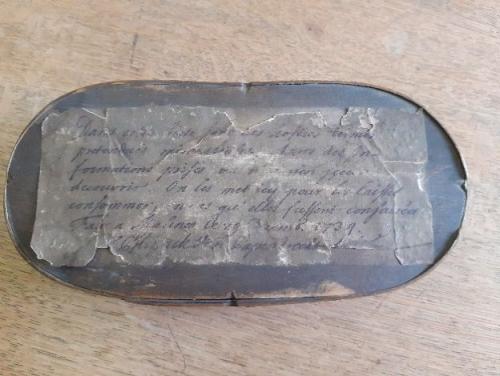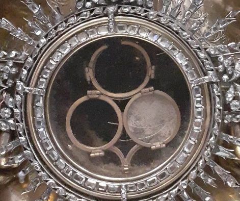 Le fond de la boite est tacheté de traces rosées de la taille des lunules de l’ostensoir des trois hosties vénérées à la collégiale-cathédrale de Bruxelles. Les autorités ecclésiastiques actuelles du diocèse ont cru bon de « décider définitivement » de ne pas donner suite à nos requêtes pour une analyse scientifique.